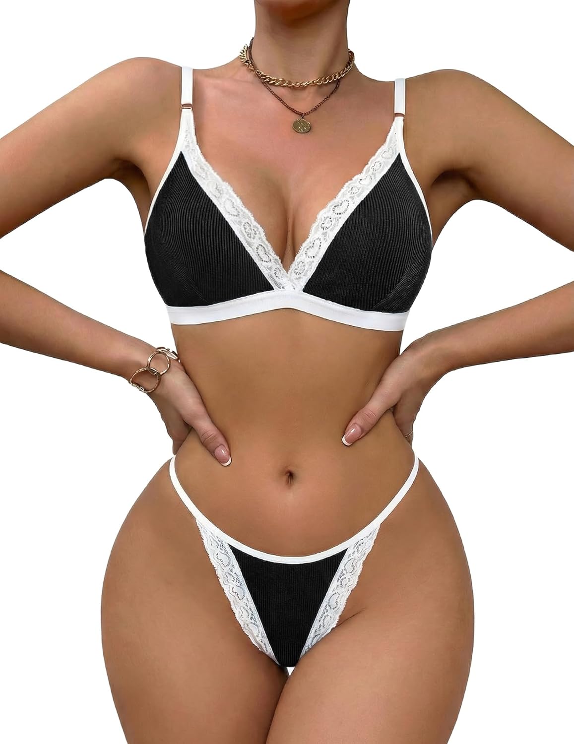 Avidlove Lingerie Sets for Women Sexy Ribbed Bra and Pany Set with Lace Trim 2 Pieces Bralettes Lingerie Outfits
