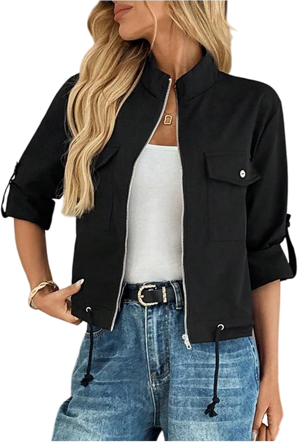 Verdusa Women's Zip Up Jacket Casual Roll Up Sleeve Jackets Elegant Outerwear with Pockets Black X-Large