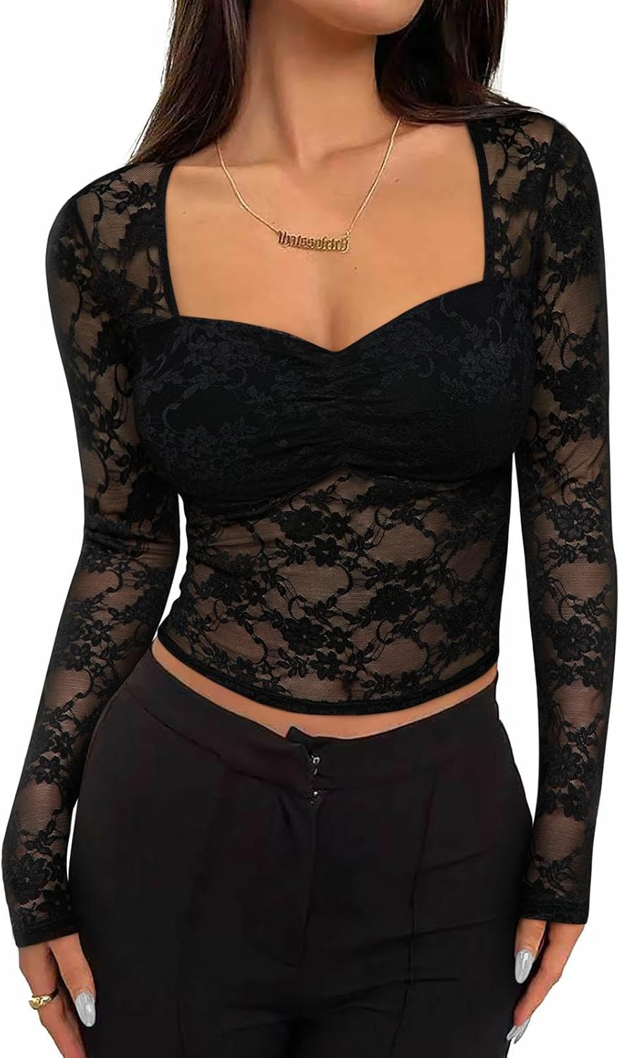 REORIA Womens Sexy Sheer Mesh Tops Floral Lace Long Sleeve Shirts Low Cut Slim Fitted Outfits See Through Going Out Blouses