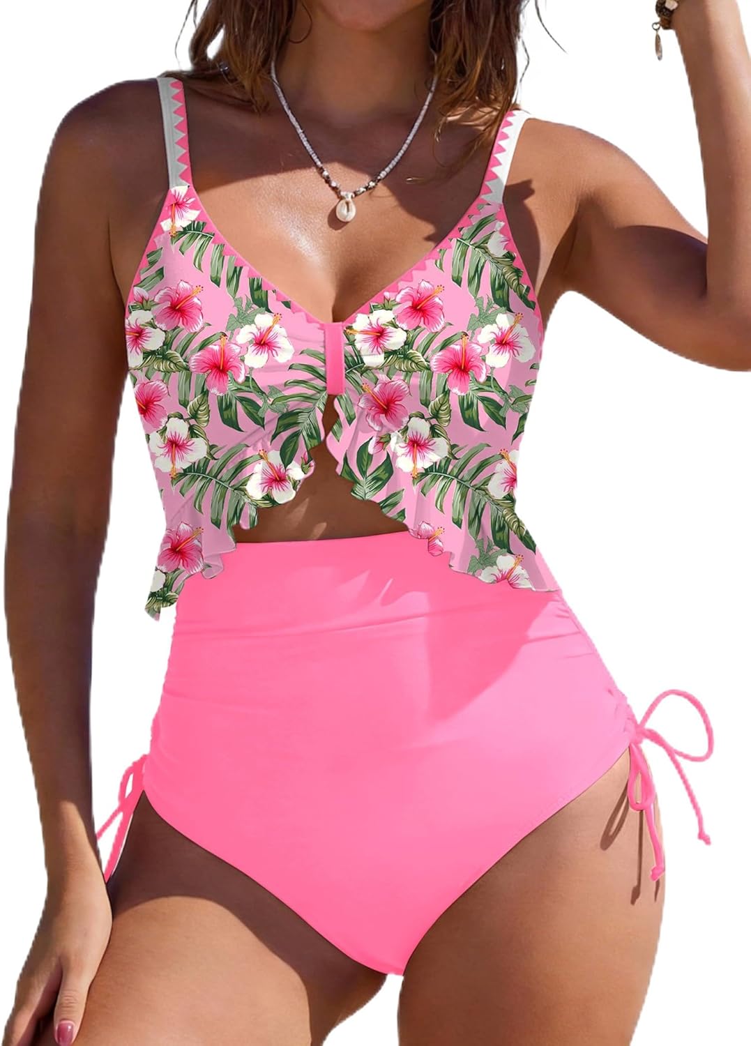 SHESHOW Womens Tummy Control One Piece Swimsuit High Waisted Cutout Ruffle Bathing Suit Color Block Swimsuits S-XXL
