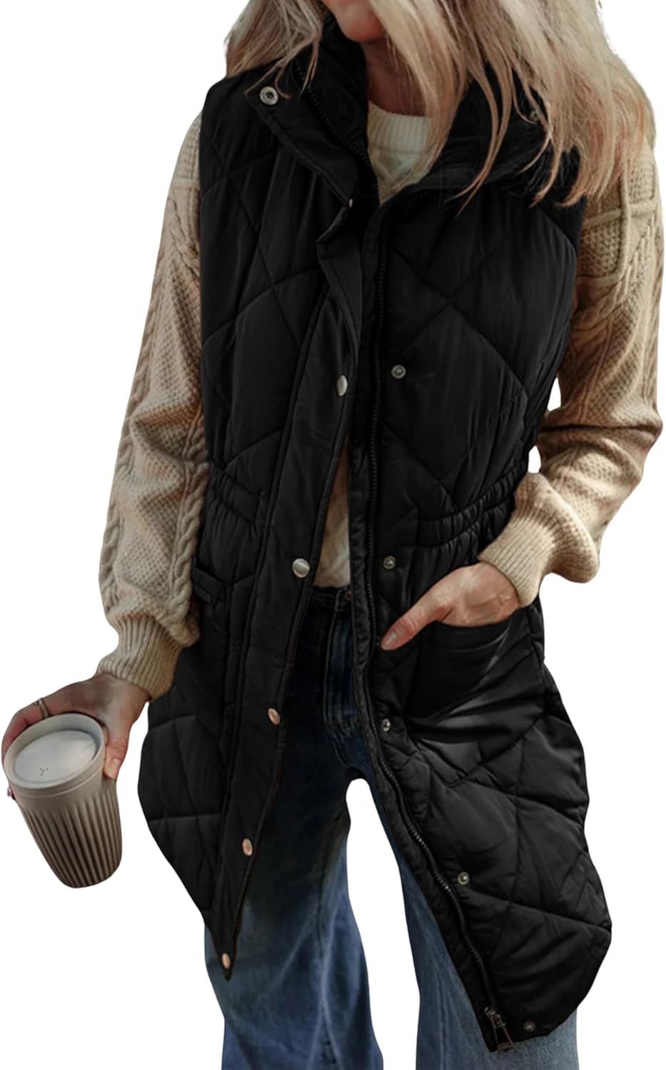 Athlisan Womens Long Puffer Vest Sleeveless Zip Up Stand Collar Padded Gilet Coat with Pockets(Black-L)