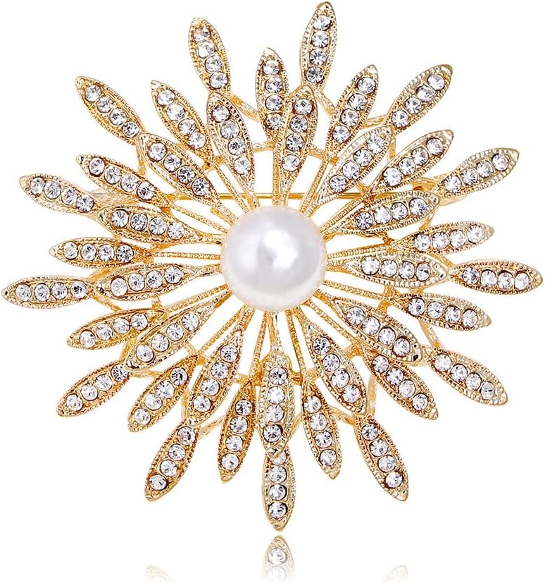 14K Gold Plated Flower Brooch Pin for Women Girls Simulated Pearl Rhinestone Floral Pin Clip Lapel Sweater Scarves Dress Suit Jackets Collar Corsage Brooches Pins Delicate Decoration Jewelry Gifts