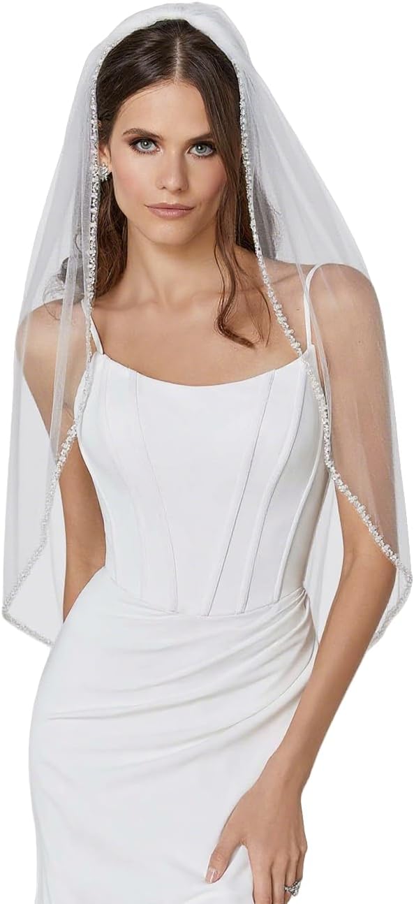 azaleas Bridal Wedding Veil Crystal Beaded Edge Wedding Veil With Comb 1 Tier (Off-White - 100cm/39in)