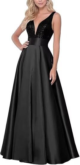 Sparkly Sequin V Neck Bridemaid Dress A Line Satin Wedding Prom Dress for Women Formal Evening Gowns with Pockets