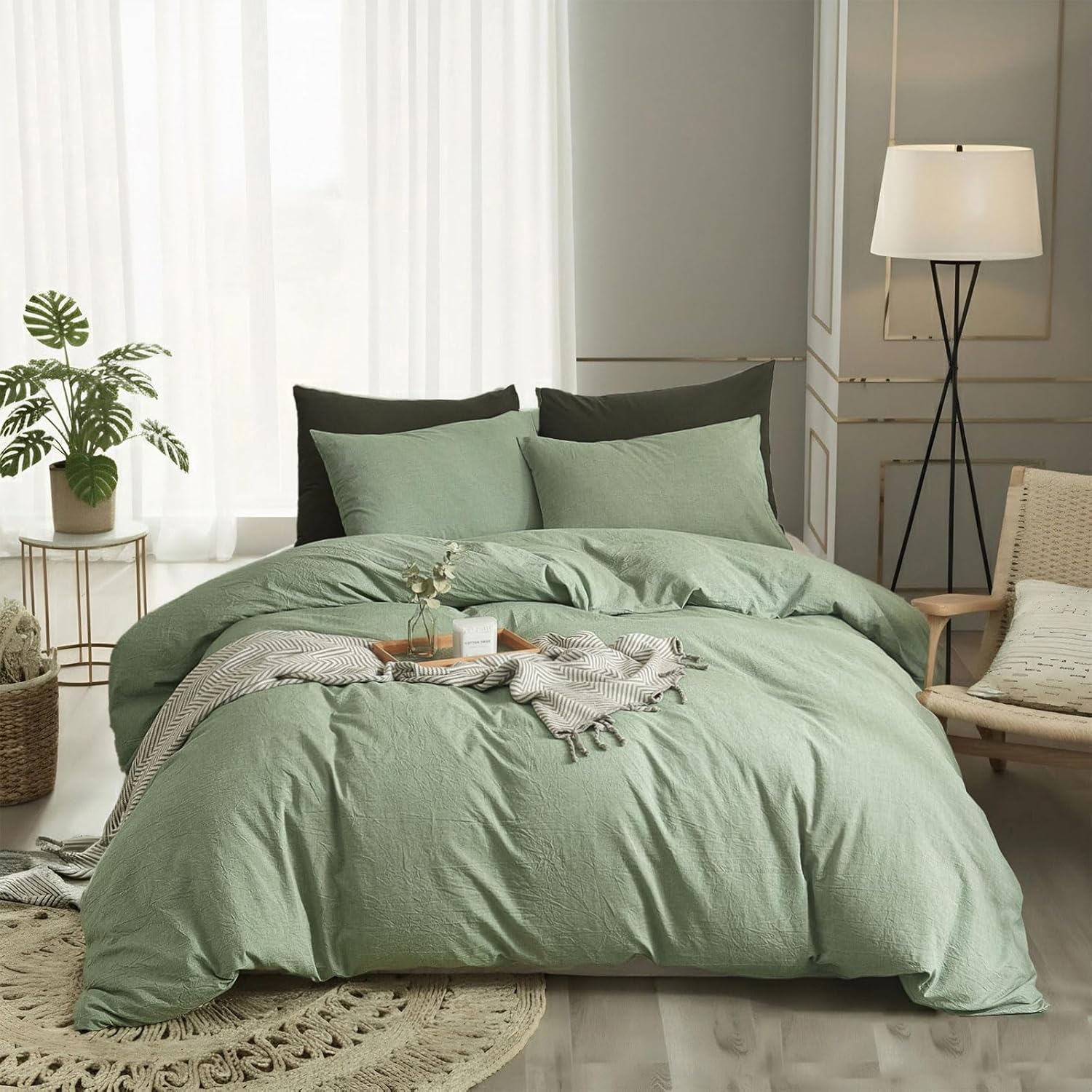 Light Green Bedding Duvet Covers King Size, 100% Washed Cotton Bedding Set (1x104x90 Duvet Cover and 2x20x36 Pillowcases), Cozy Soft Duvet Quilted Cover Set with Zipper, 4 Ties