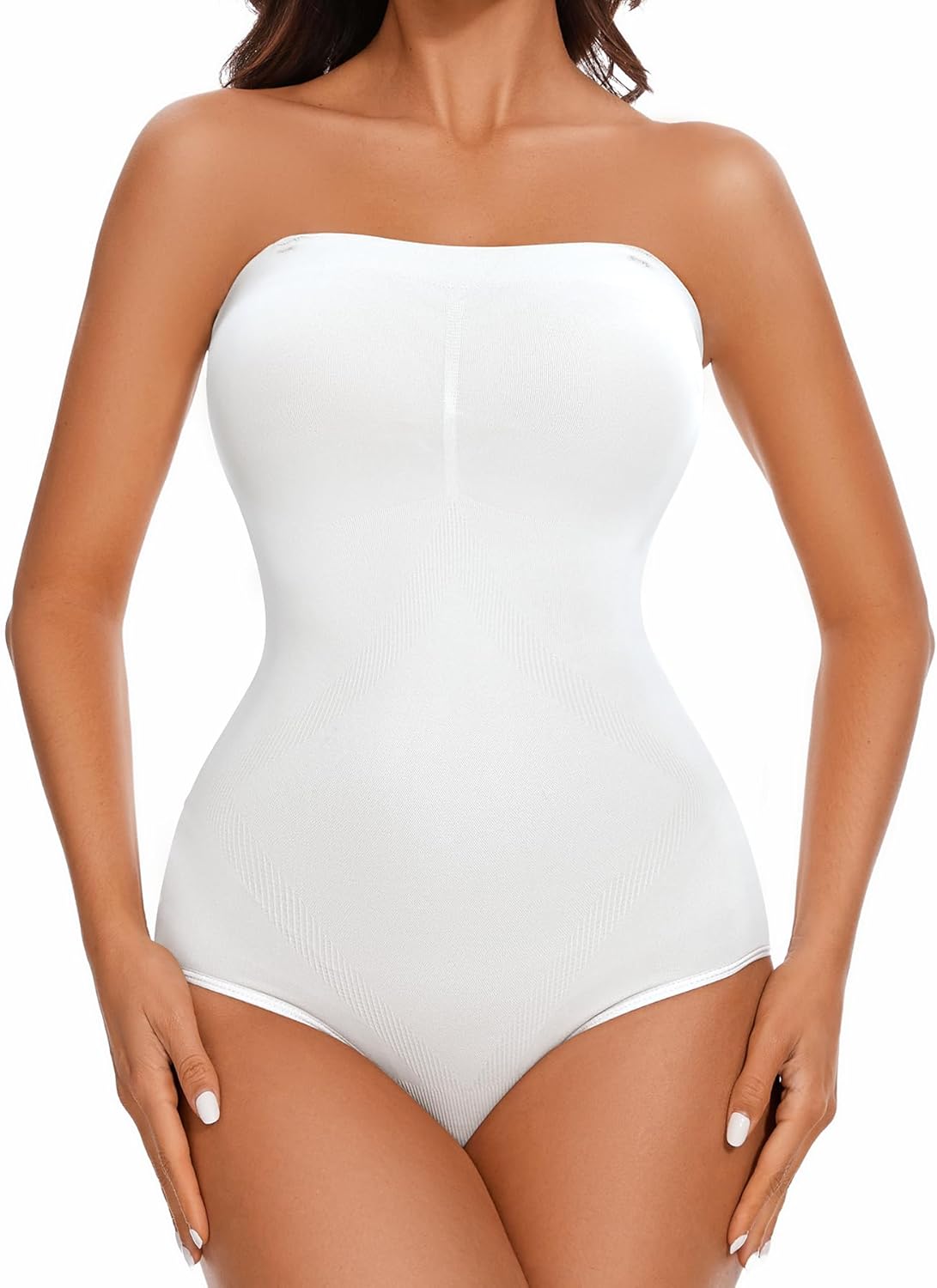 Fisoew Women's Strapless Shapewear Tummy Control Thong Bodysuit One Piece Tube Top Seamless Body Shaper
