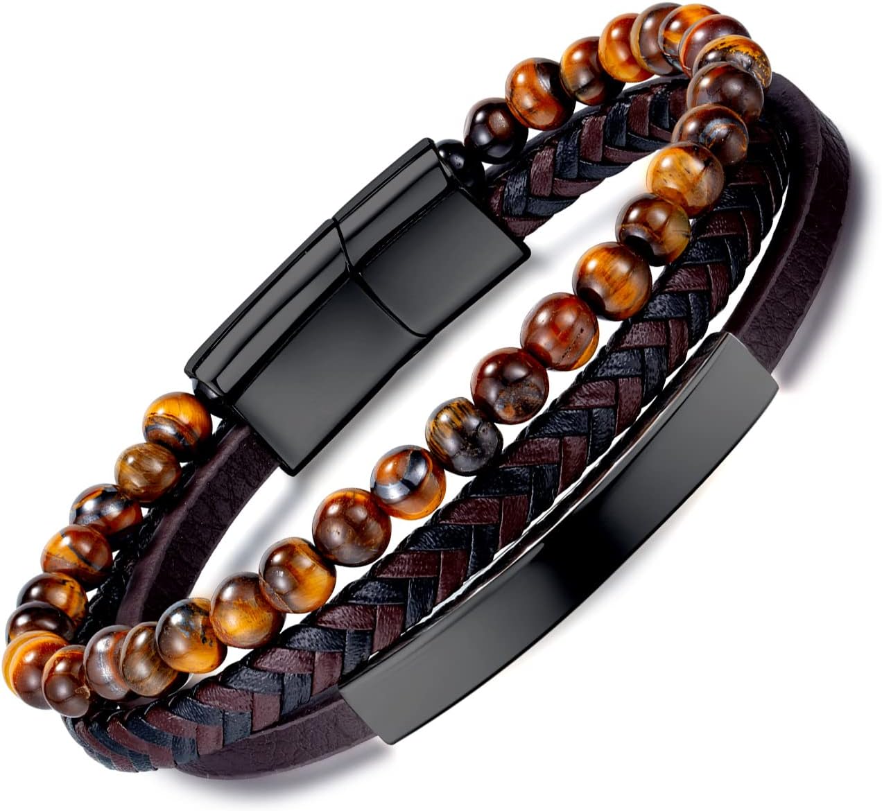 Tiger Eye Leather Bracelet Beaded Bracelet for Men Leather Bracelet - Many Layer Black Leather Bracelets Wristband with Adjustable Spiritual Jewelry, Trendy Design Gift for Men