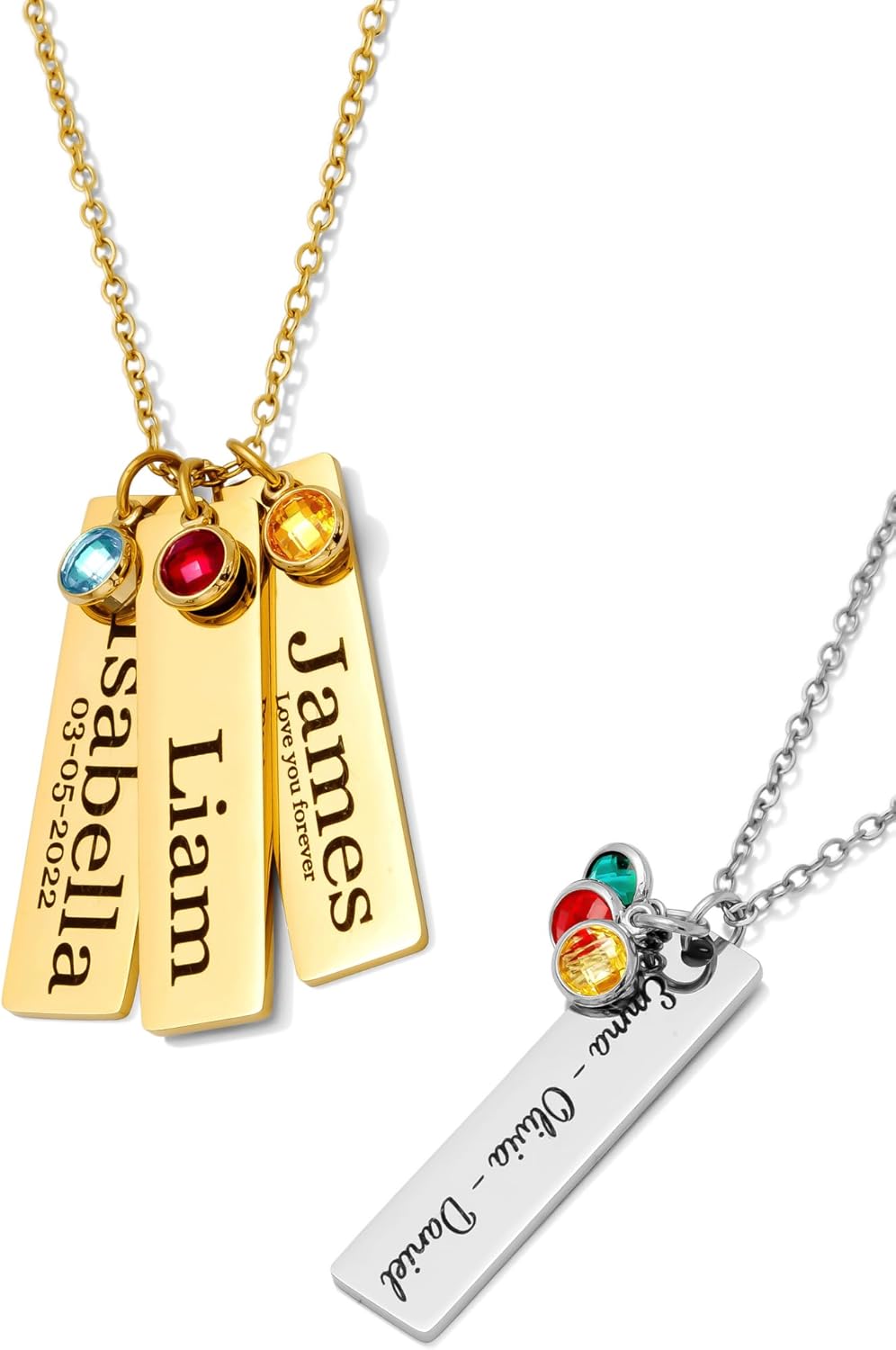 Personalized Birthstone Name Necklace – Custom Engraved Stainless Steel Pendant with 1 to 4 Name Bars – Gold & gold PVD Plated – Non-Tarnish – Gift for Her, Mom, Dad – Adjustable Chain