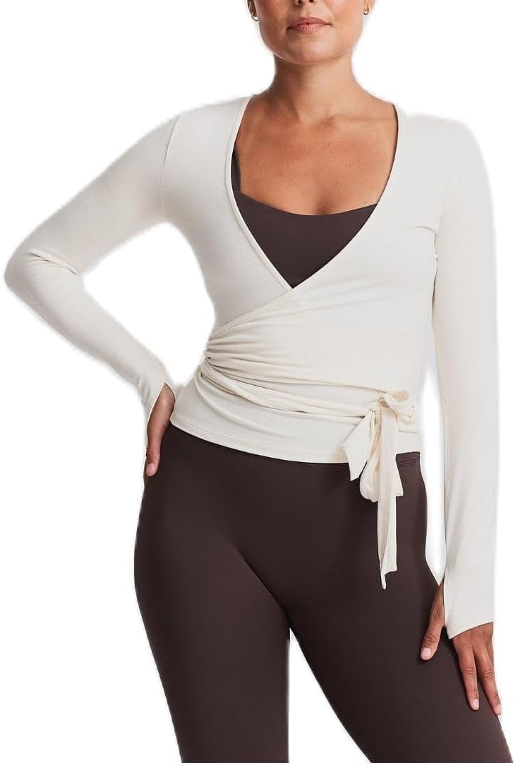 Women Y2k Long Sleeve Wrap Crop Top Ballet Pilates Workout Yoga Tie Front Shirts V Neck Slim Fit Wrap Corset Tops