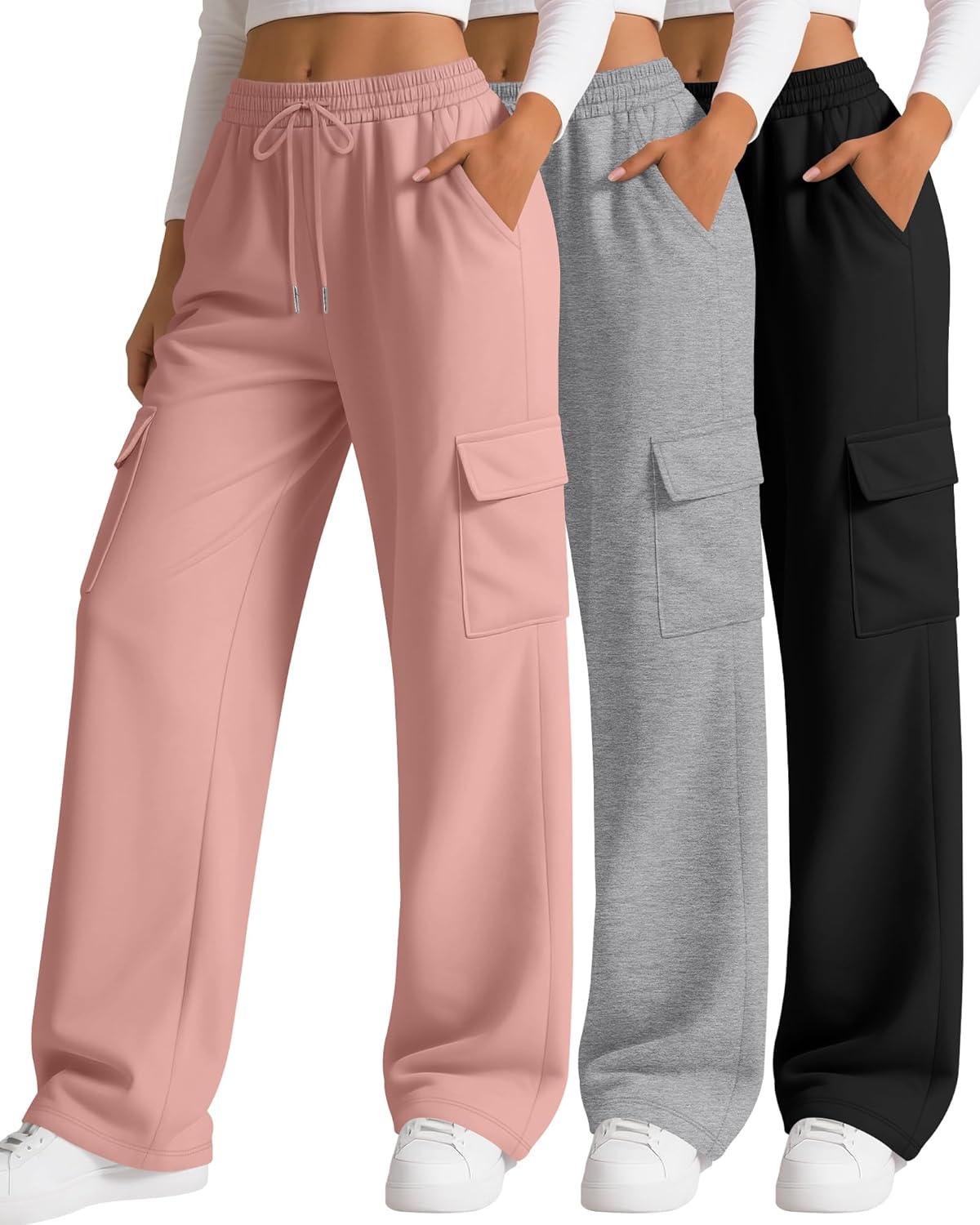 Neer 3 Pack Womens Pants with Cargo Pockets Casual High Waisted Baggy Wide Straight Leg Sweatpants Lounge Joggers Trousers
