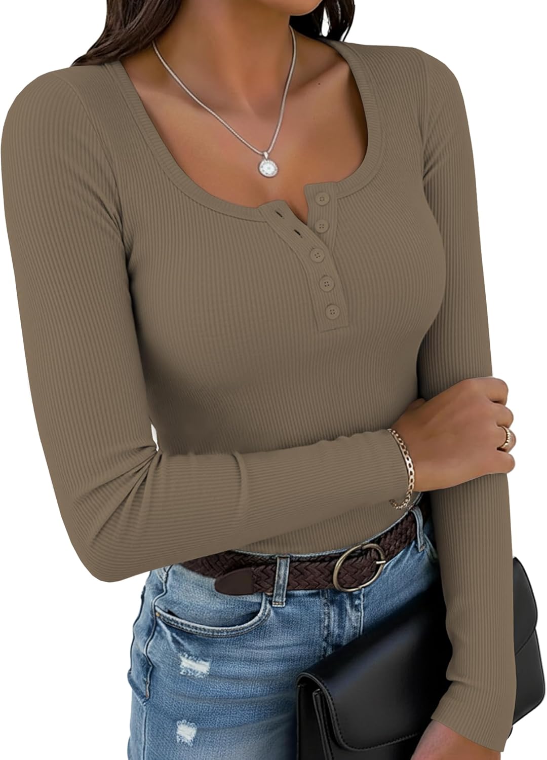 YOGINGO 2026 Women's Henley Long Sleeve Shirts - V-Neck Button Front Ribbed Knit Tops, Soft Stretchy Casual Work Blouses