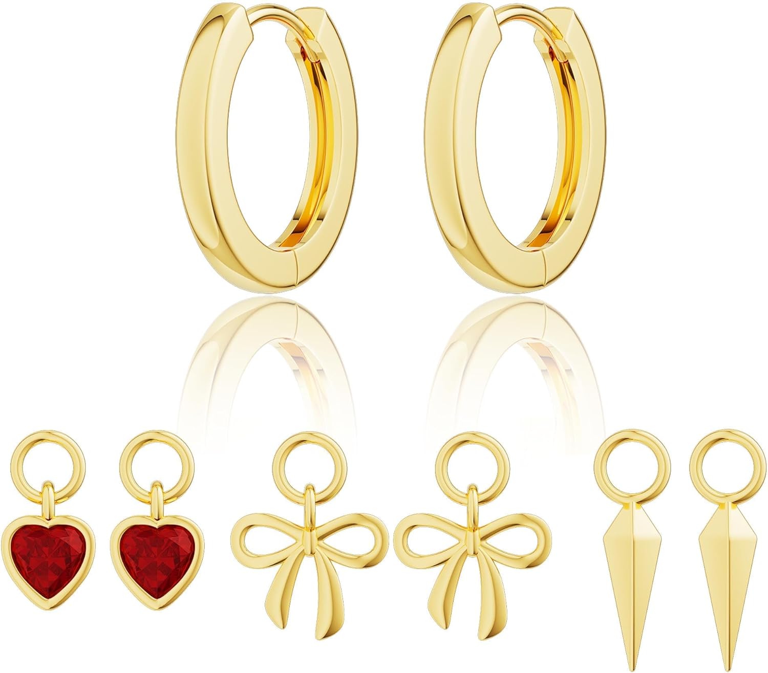 Freekiss Gold Hoop Earrings and Charm Set for Women Trendy: 14K Gold Plated Small Huggie Hoop Earrings Interchangeable Dangle Charm Set Hypoallergenic Cute Earrings Jewelry Pearl Bow Cherry Charms