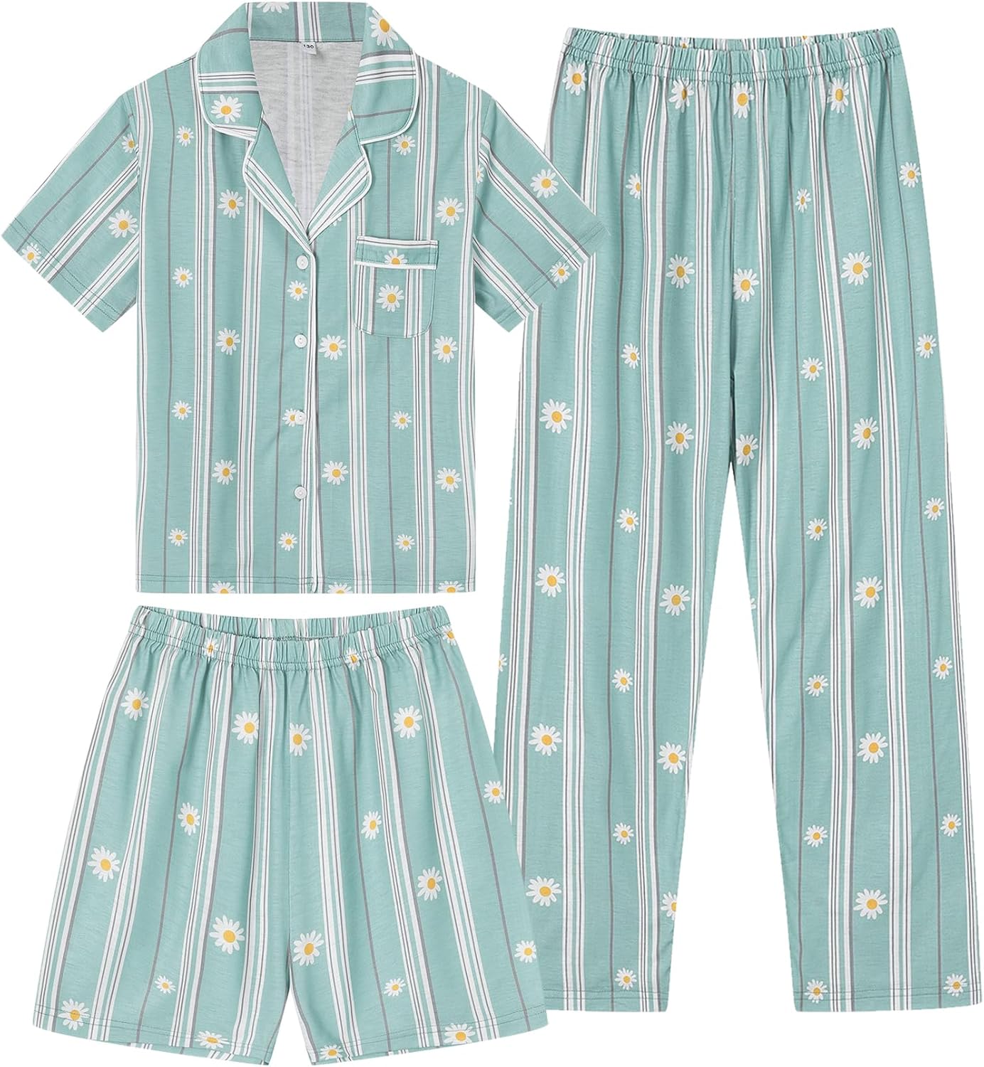 SWOMOG Kids Pajamas Sets 3PCS Short Sleeve Long Pants with Shorts Girls Boys Button Down PJS Cute Loungewear for 4T-15Years,