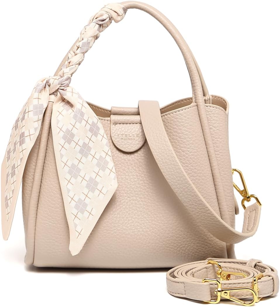 Women's bucket bag with silk scarf, black top handle shoulder bag, adjustable shoulder strap, elegant daily commuting handbag