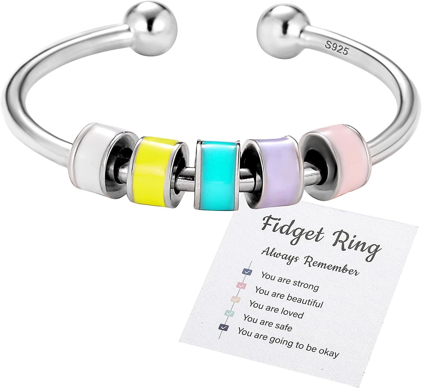 Anxiety Rings for Women, S925 Sterling Silver Adjustable Stress Spinner Rings with Beads Fidget Rings for Anxiety Women, Enamel Fidget Spinner Ring,Womens Gifts