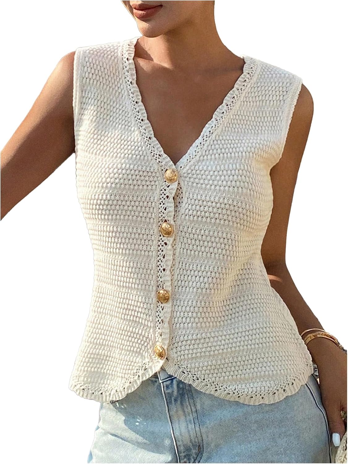 GORGLITTER Women's Crochet Tops Boho Button Up Knit Tank Top Cute Sleeveless Curve Hem Summer Vacation Going Out Outfits