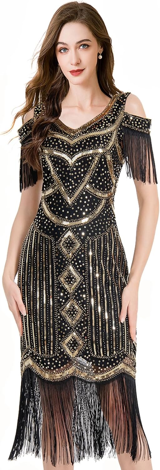 Women Flapper Dresses 1920s V Neck Beaded Fringed Great Gatsby Club & Night Out Dresses