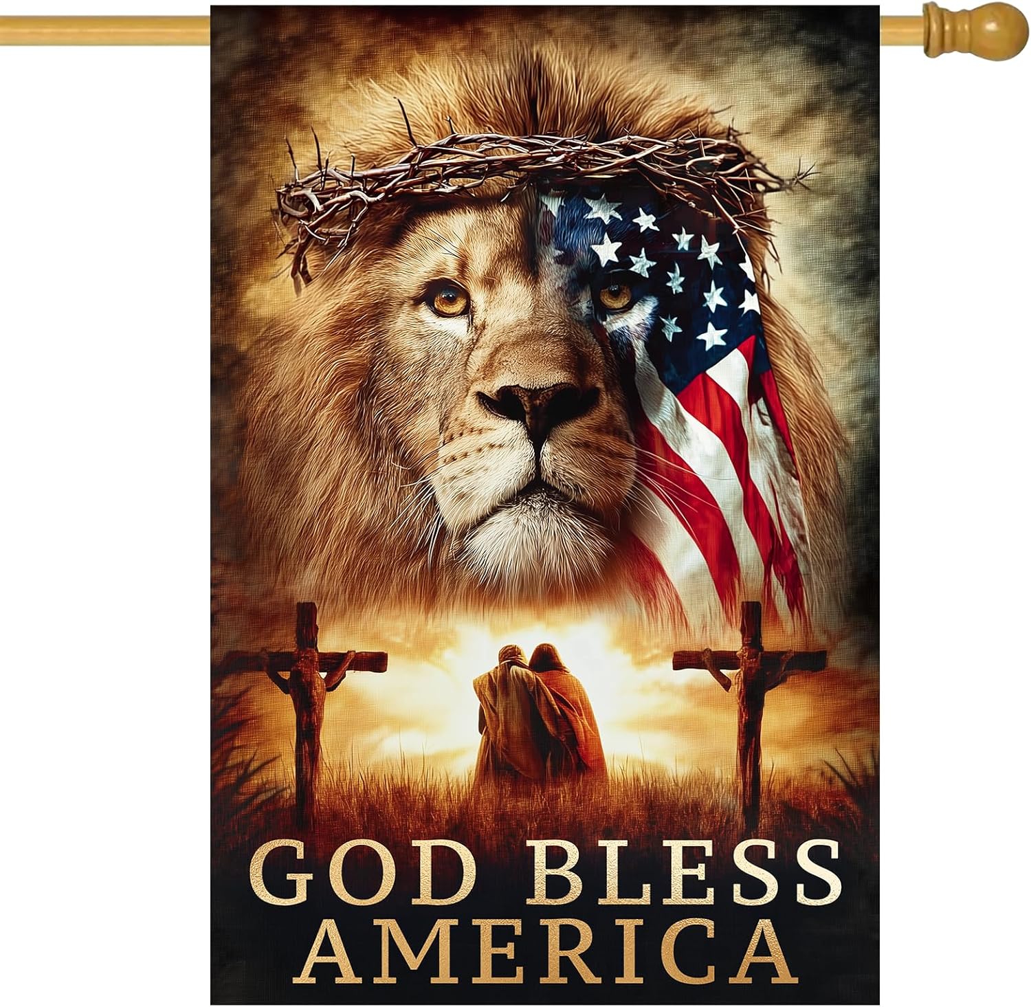 God Bless America Lion of Judah House Flag 28 x 40 Inch Double Sided Patriotic Religious Summer Fall Garden Flags Banner for Outdoor Porch Yard Decor Holiday House Flags Seasonal Decorations