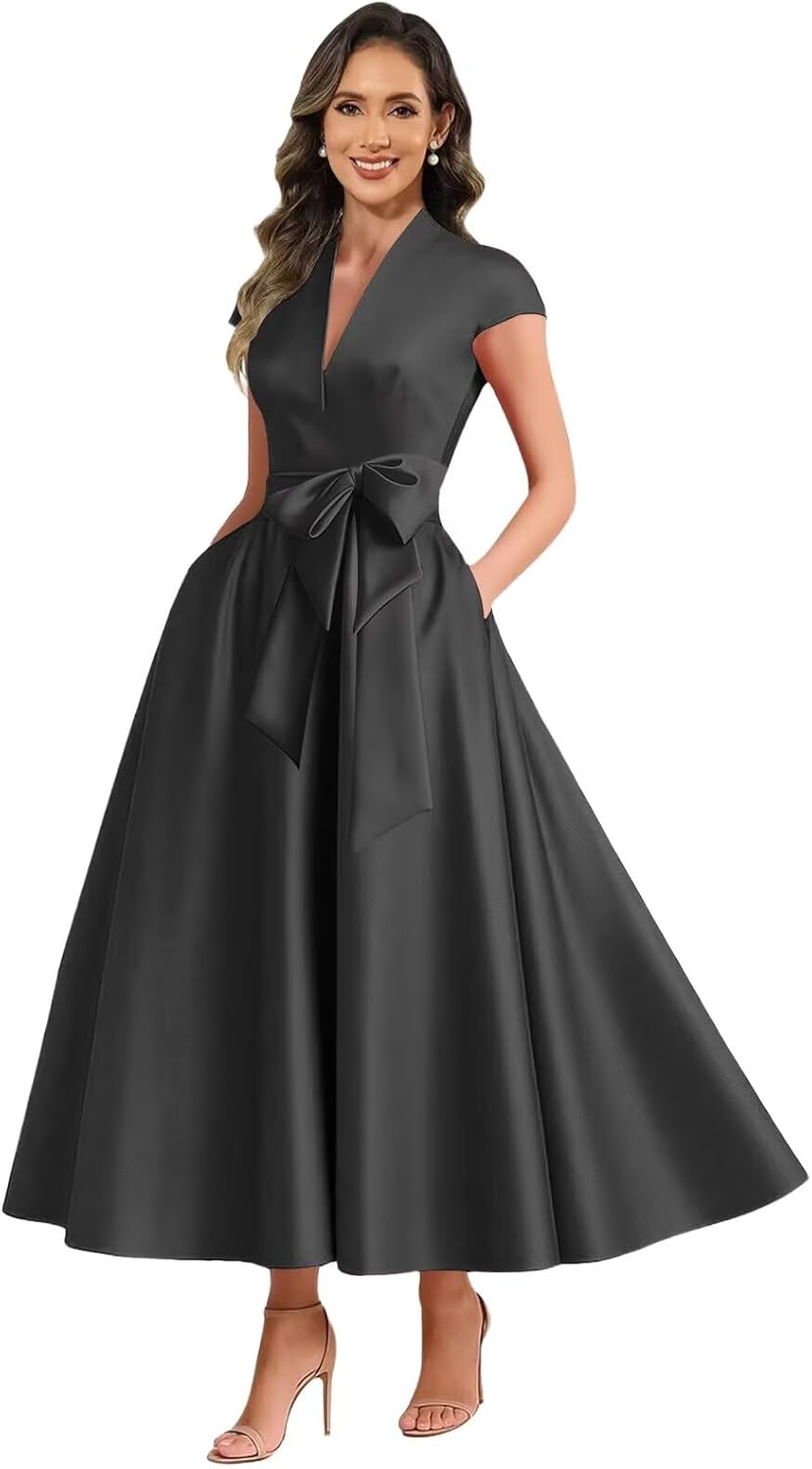 Satin Mother of The Bride Dresses Tea Length A Line Evening Gown with Pockets Formal Wedding Guest Dress