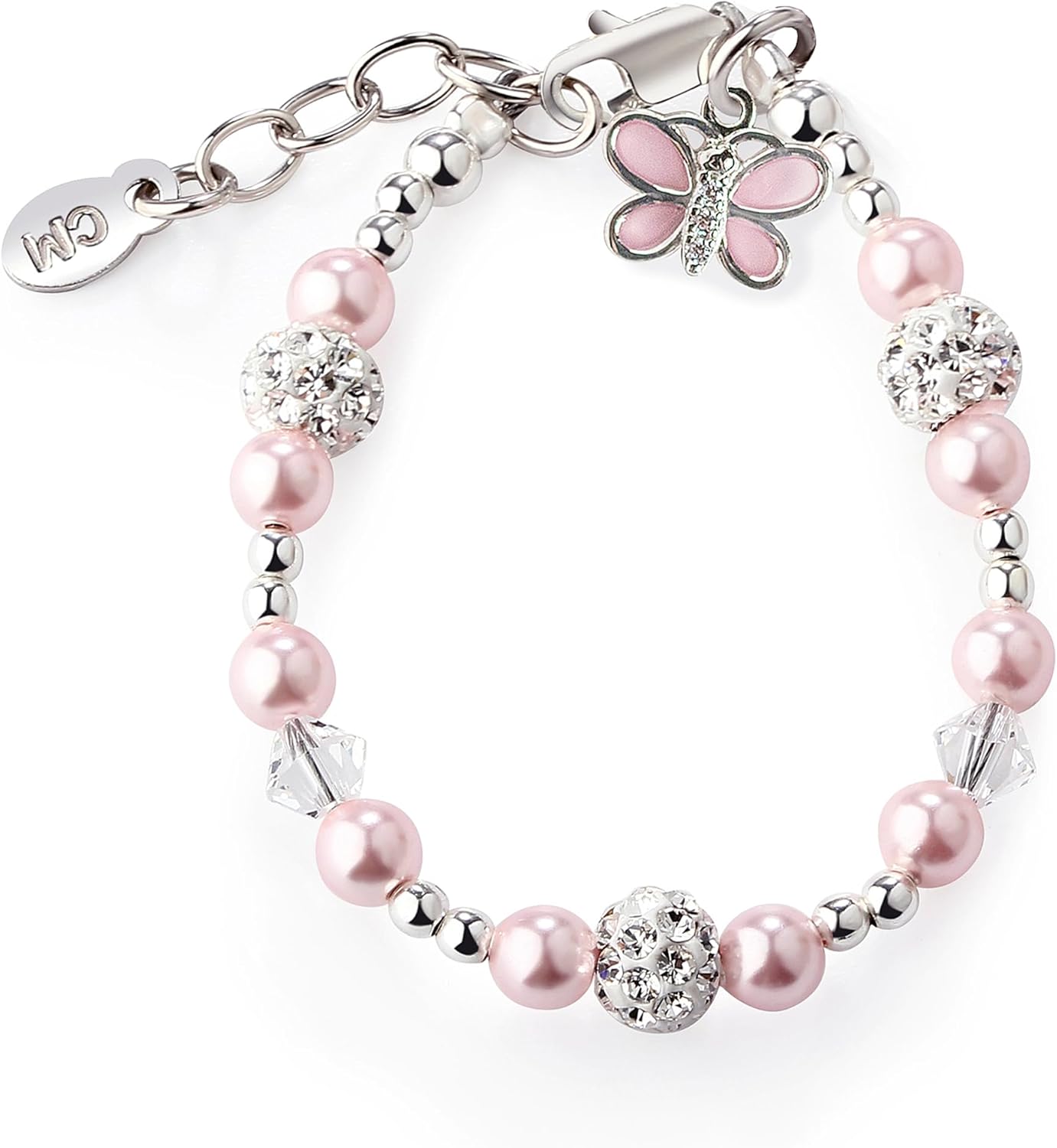 Cherished Moments 925 Sterling Silver Pink Butterfly Charm Bracelet for Babies, Toddlers or Little Girls. Simulated Pink Pearls, Crystals and Stardust Beads, Gift for Birthday or Granddaughter