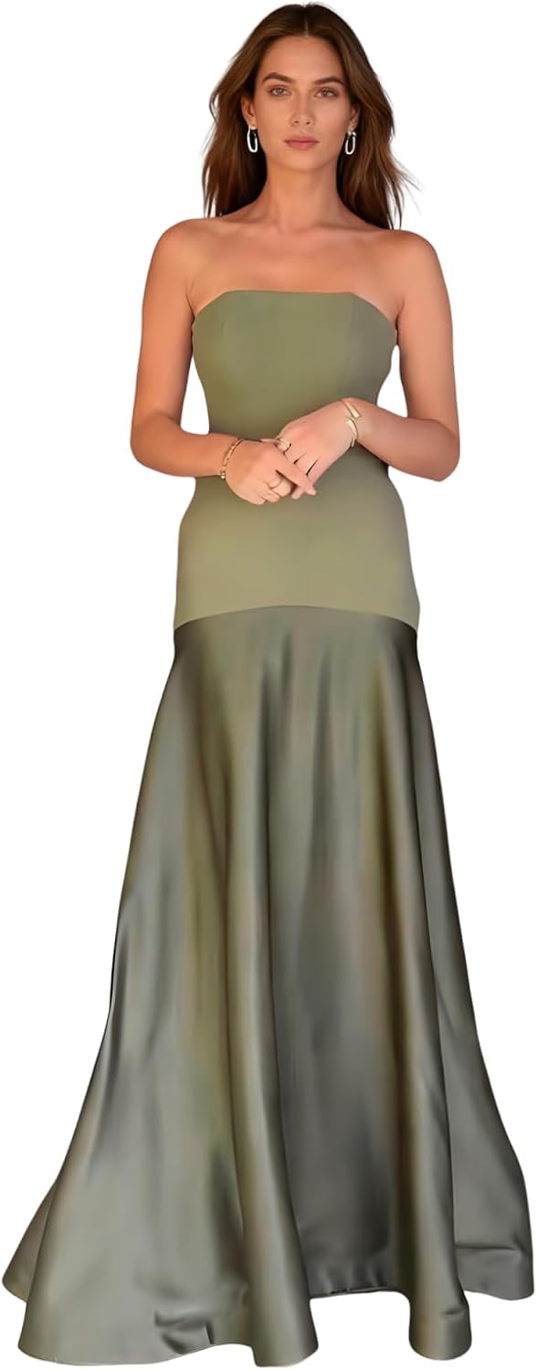 ANKOMINA Women's Elegant Strapless Satin Maxi Dress Sexy Off Shoulder Patchwork Party Evening Cocktail Long Dresses Green