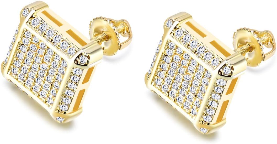 18K Gold Plated 925 Sterling Silver Iced Out Cubic Zirconia Screw Back Square Stud Earring For Men and Women Hypoallergenic Earring TwoTone Micropave Hip Hop Jewelry-Gold