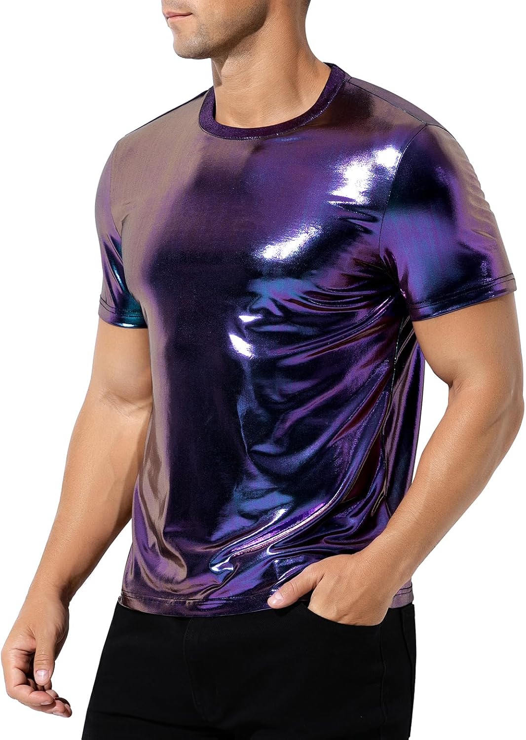 Arjen Kroos Men's Sexy Shiny Metallic T-Shirts Short Sleeve Sparkly Shirts Disco Holographic Tops