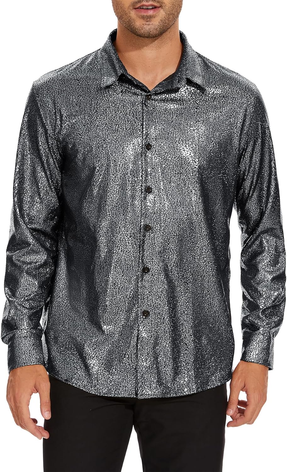 Zando Mens Disco Shirt Outfit Retro 70s Shirts for Men Sequin Glitter Long Sleeve Button Down Disco Outfits Party Costume