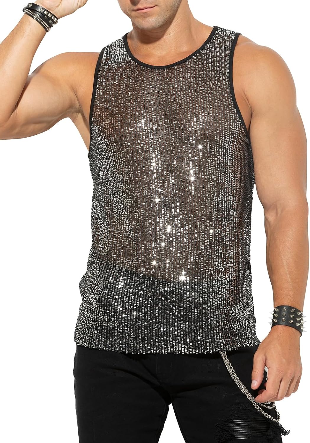 Arjen Kroos Men's Sexy Sparkly Tank Top See-Through Mesh Sequin Disco Vest