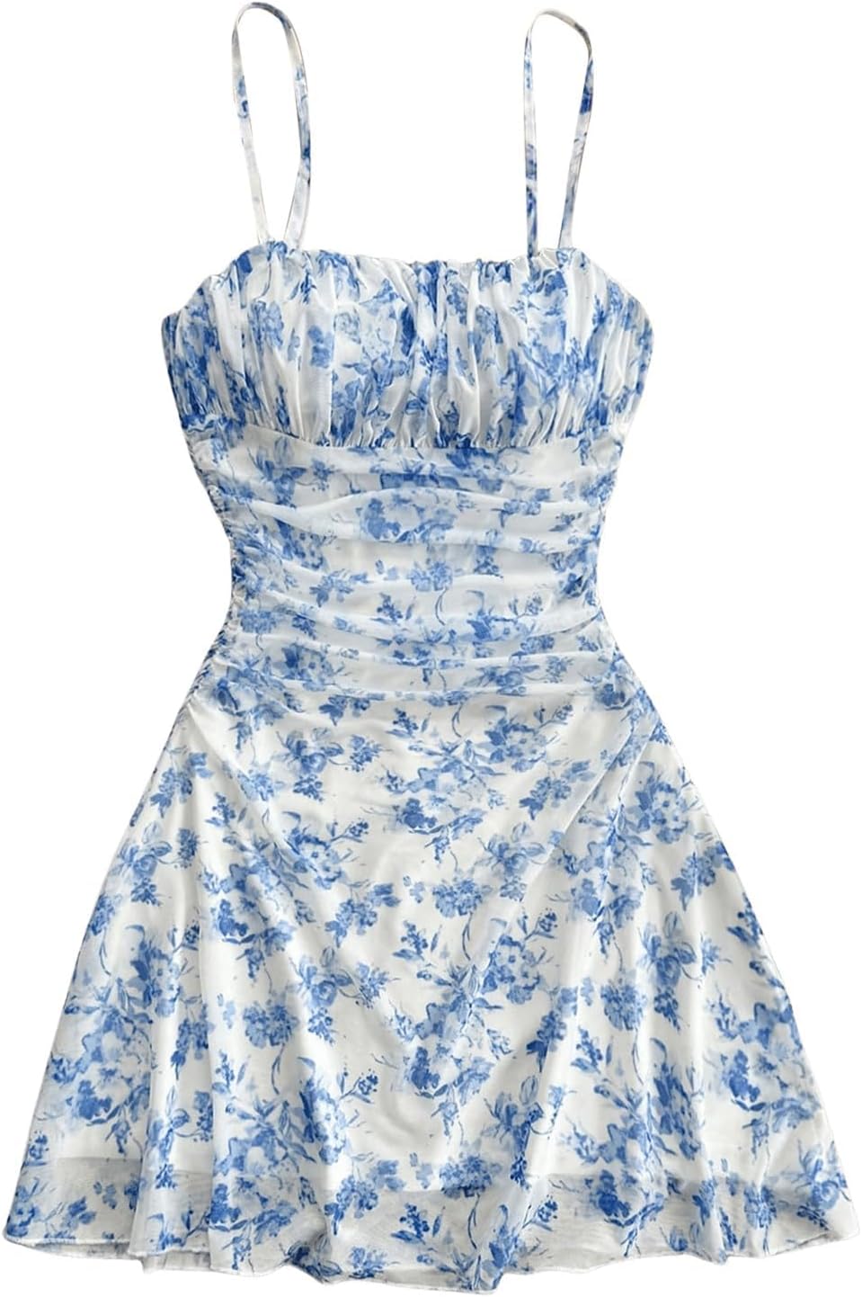 WDIRARA Women's Floral Print Ruched Cami Dress Spaghetti Strap Ruffle Hem Mesh Mini Dress