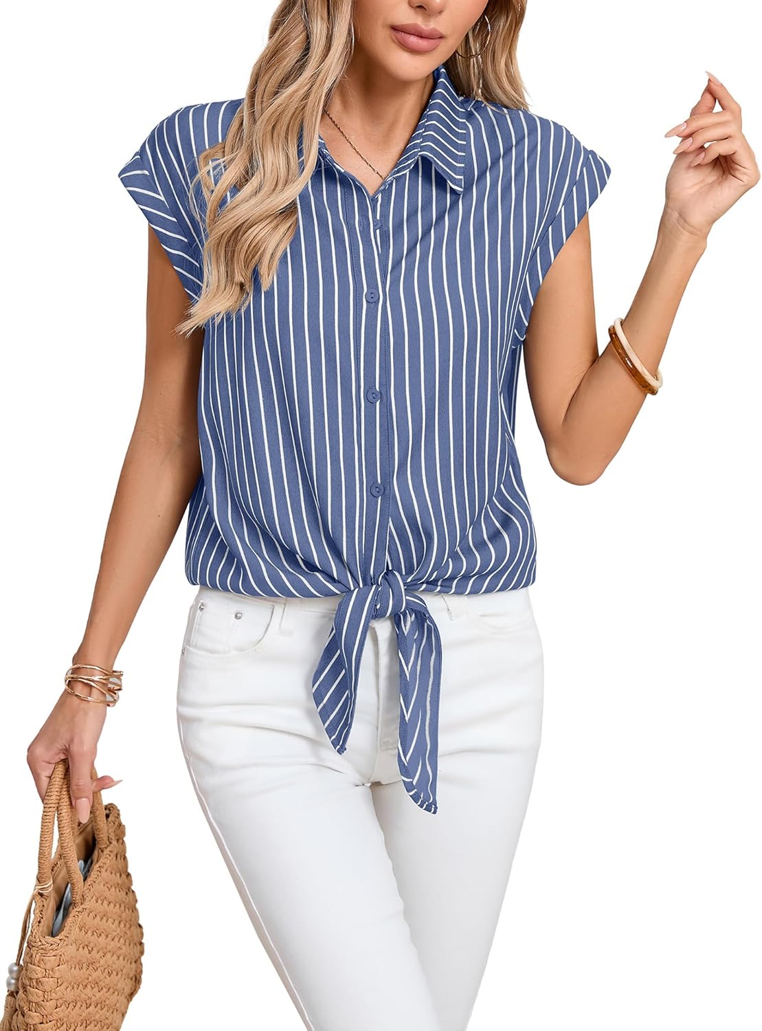 Women's Striped Button Down Shirts Short Cap Sleeve Tie Front Blouse Summer Casual Tops