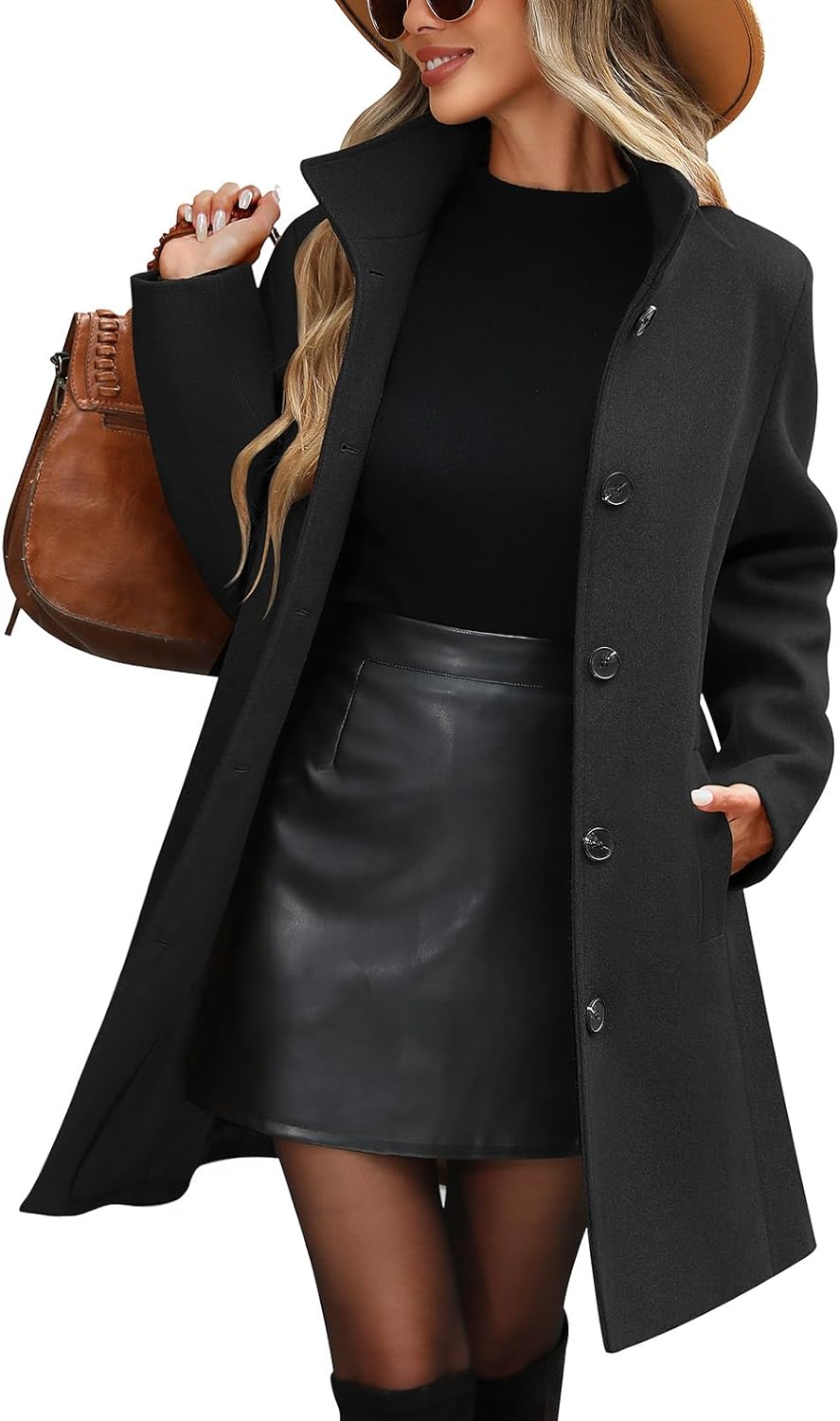 Women's Winter Single Breasted Pea Coat Casual Stand Collar Overcoat Work Office Classic Jacket with Pockets