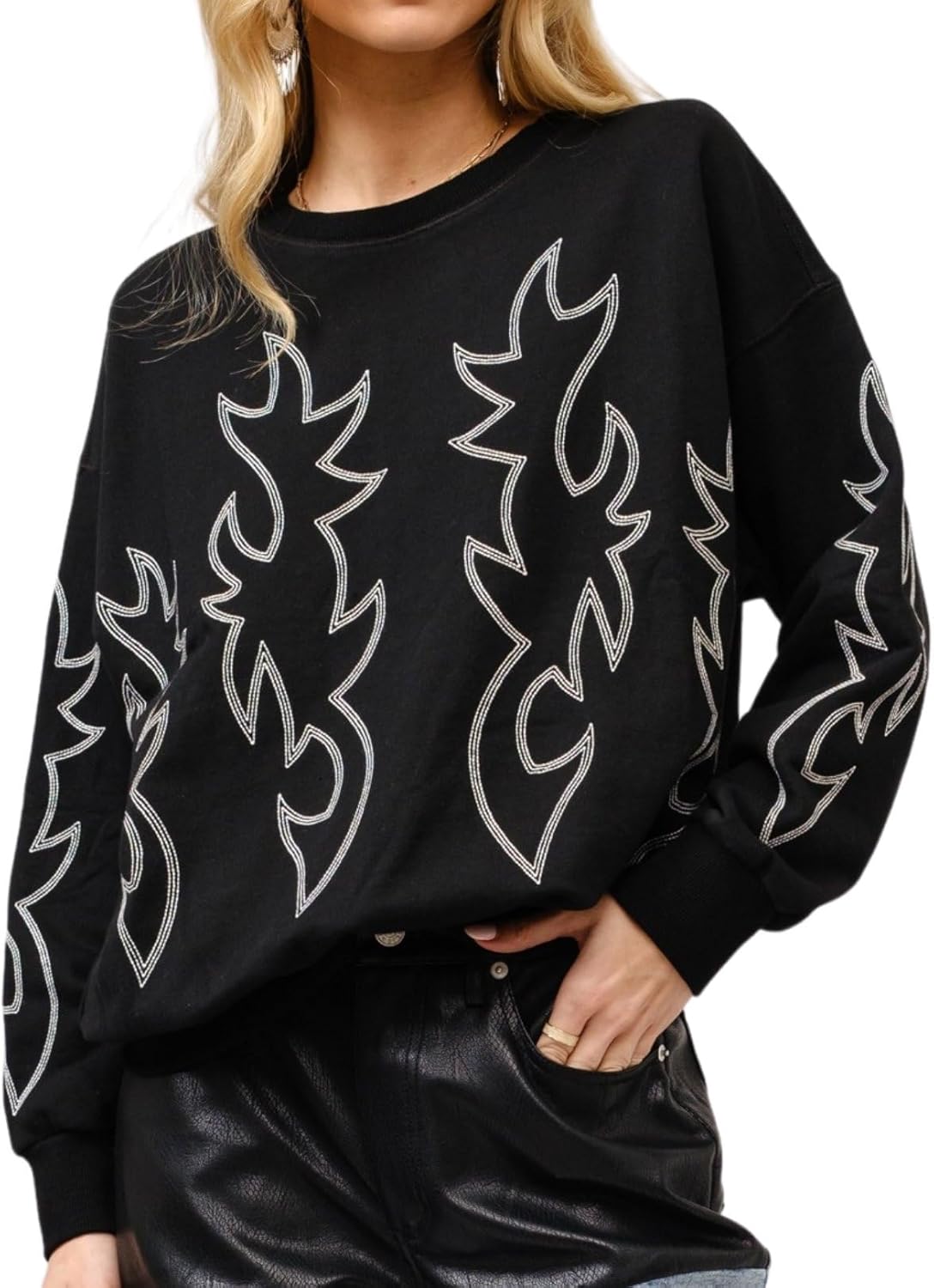 Women's Western Boots Stitch Sweatshirt Retro Crewneck Pullover Long Sleeve Pullover Sweater Tops