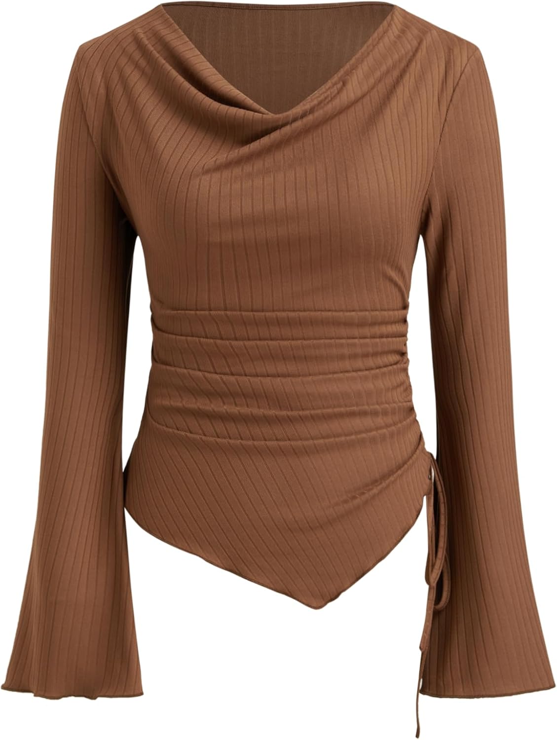 CIDER Long Sleeve Tops for Women Trendy Cowl Neck Asymmetrical Hem Ruched Going Out Tops Spring Fall Fashion