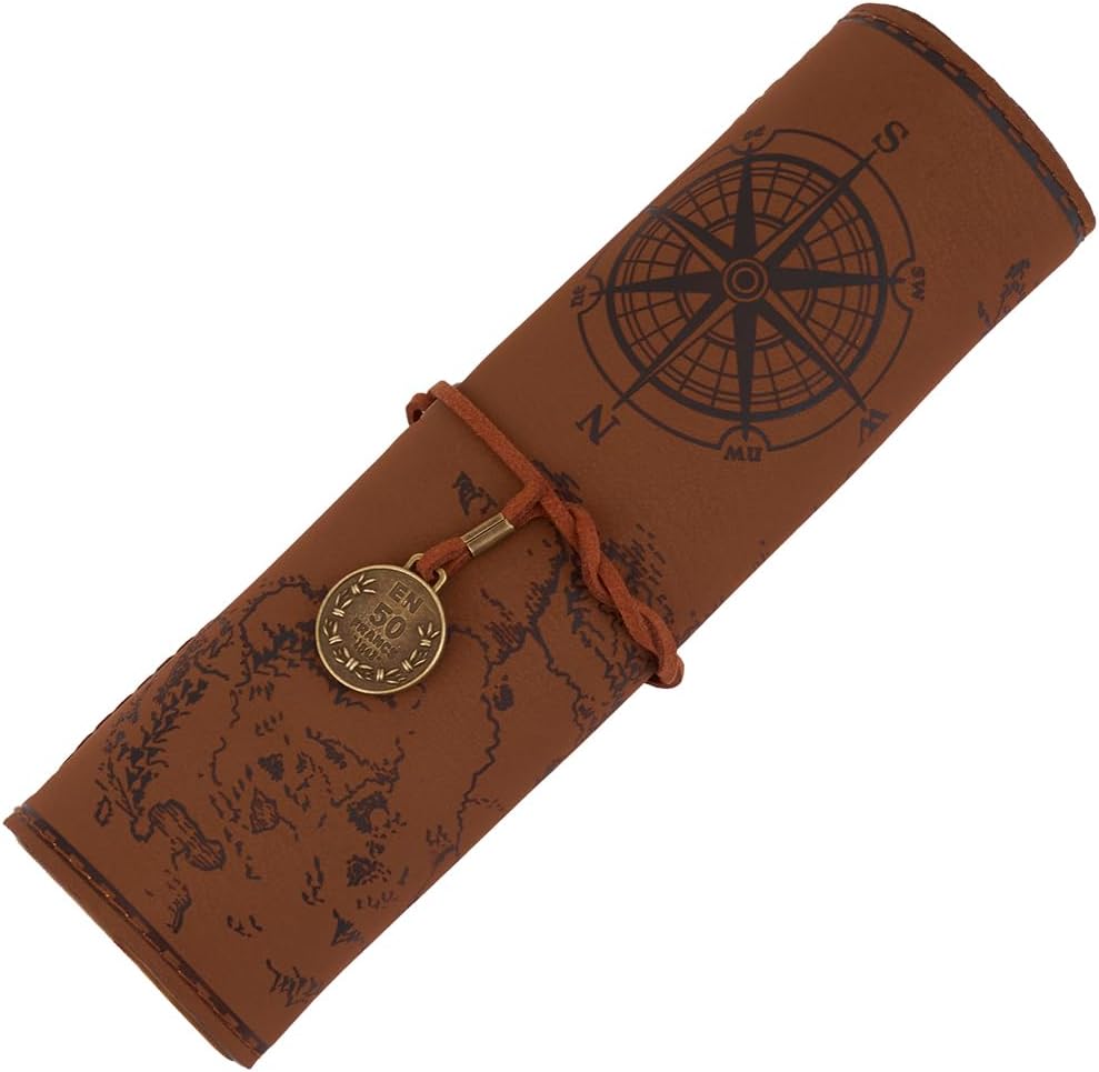 GORGECRAFT PU Leather Pencil Bag Strap Vintage Treasure Map Compass Cover Rollup Storage Organizer Retro Pen Bag Wrap Roll Case Holder Portable Stationery Pouch for Artist Drawing Makeup Camel