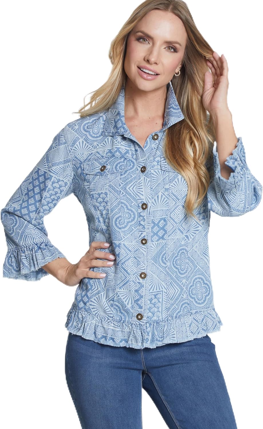 MULTIPLES womens Ruffle Three Quarters Sleeves Two-pocket Ruffle Hem Jean Jacket