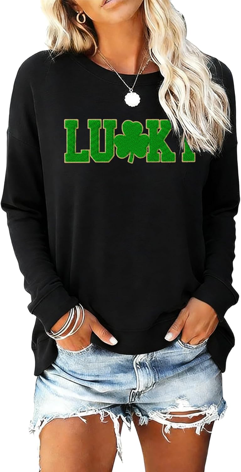 St Patricks Day Sweatshirts for Women Irish Lucky Clover T-Shirts Embroidered St Pattys Sweater Long Sleeve