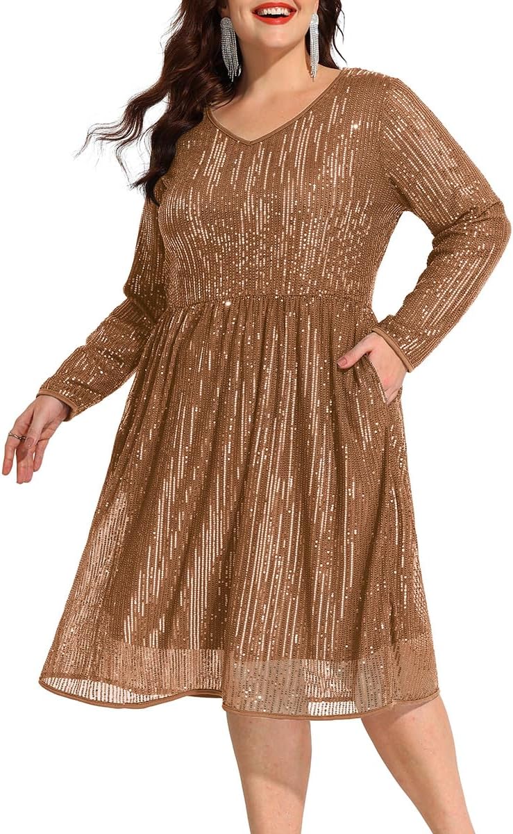 CARCOS Plus Size Sequin Dresses for Women V Neck Long Sleeve Party Dress Sparkle Club Dresses Evening Wedding Dresses XL-5XL