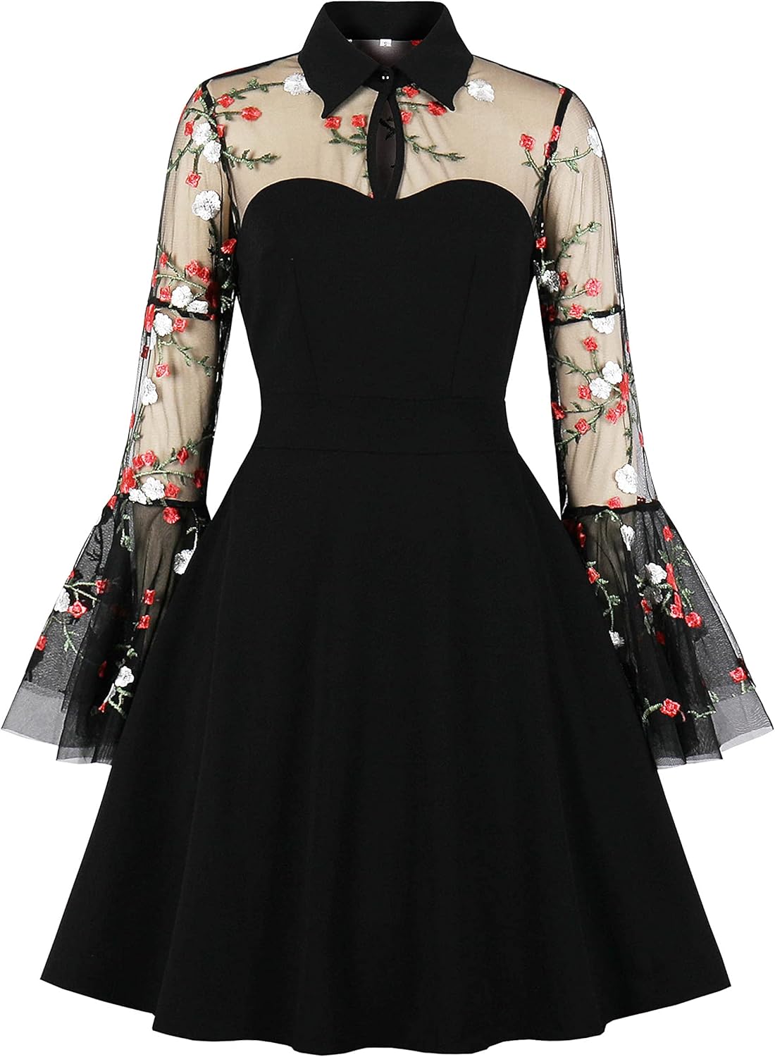 Wellwits Women's Embroidery Mesh Bell Sleeve Gothic Dress