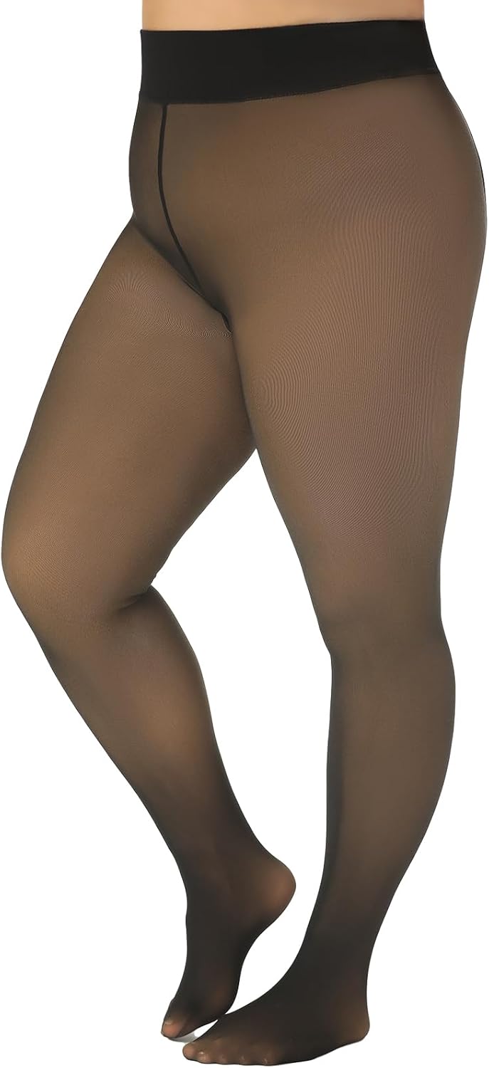 Plus Size Fleece Lined Tight, Fake Translucent Winter Warm Thermal Leggings for Women, Black Thick Pantyhose