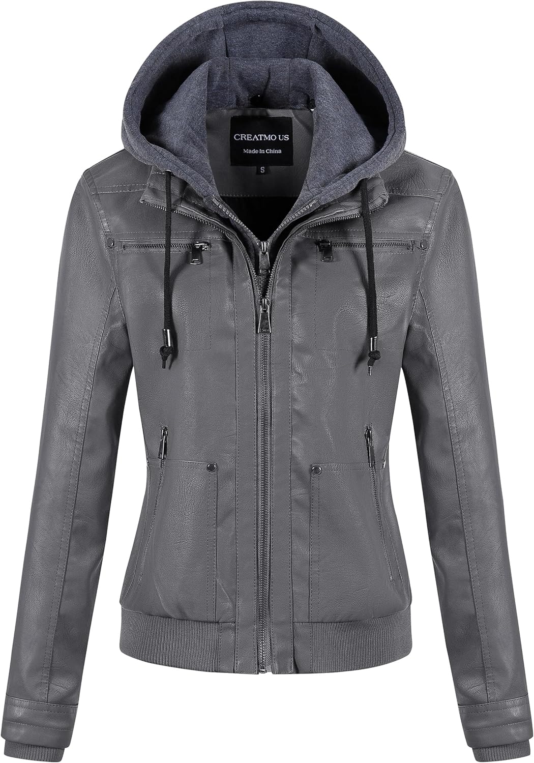 CREATMO US Women's Faux Leather Jacket Waterproof Motorcycle Bomber Jacket Vintage PU Moto Biker Coat With Removable Hood