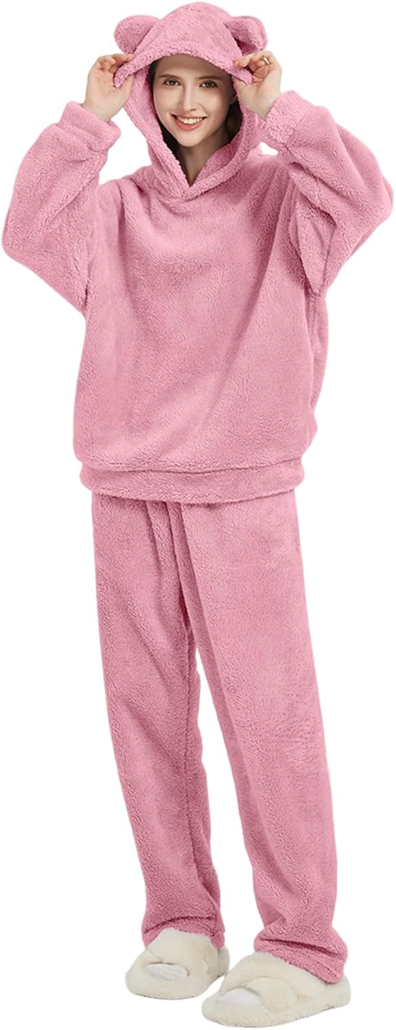 Yimoon Women's Fuzzy Pajamas Sets Hooded Bear Ear Fleece Loungewear Warm Soft Cozy Fluffy 2 Piece Outfits