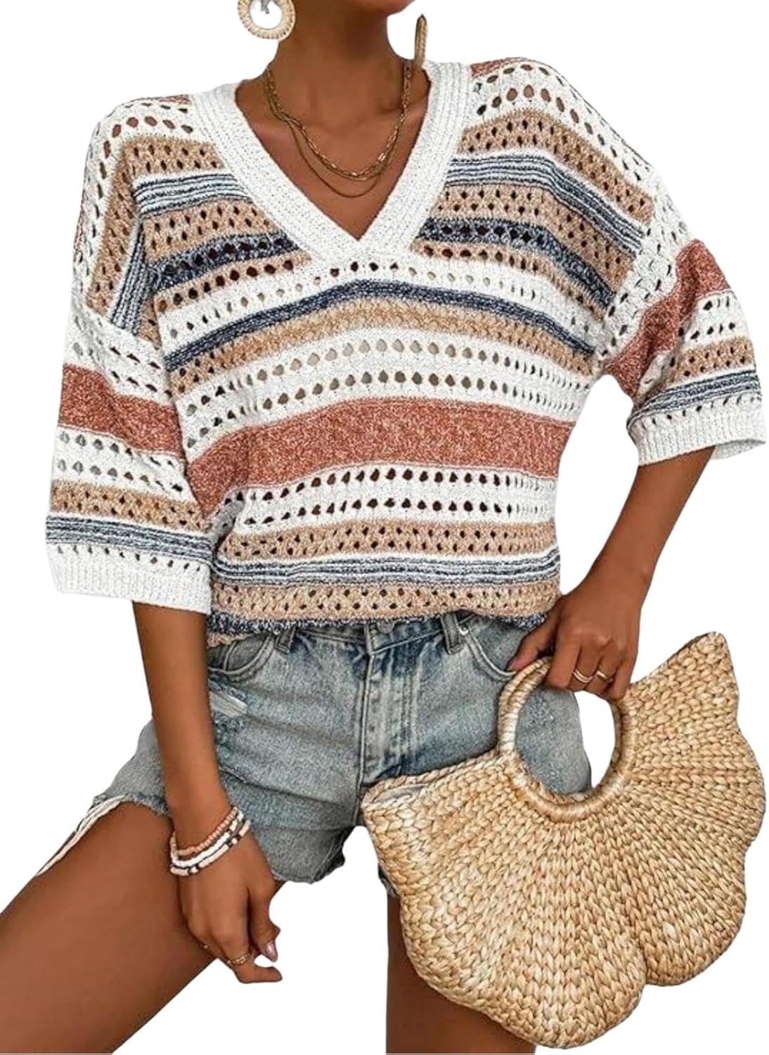 jonivey Womens 3/4 Sleeve V Neck Fall Casual Crochet Knit Sweater Hollow Out Striped Tops Vacation Outfits