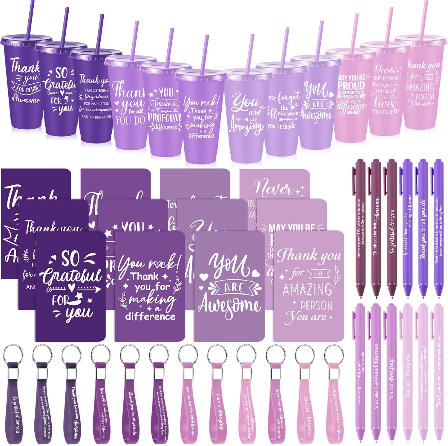 - Appreciation Gifts Bulk: 12 thank you plastic cups with lids and straws, 12 purple ballpoint pens, 12 purple notebooks, 12 silicone keychains, purple styles and sufficient quantity, you can send these inspiring motivational sets to employees, colleagues, partners, teammates to express your love and care; Say "thank you" in a meaningful and memorable way with employee appreciation gift boxes