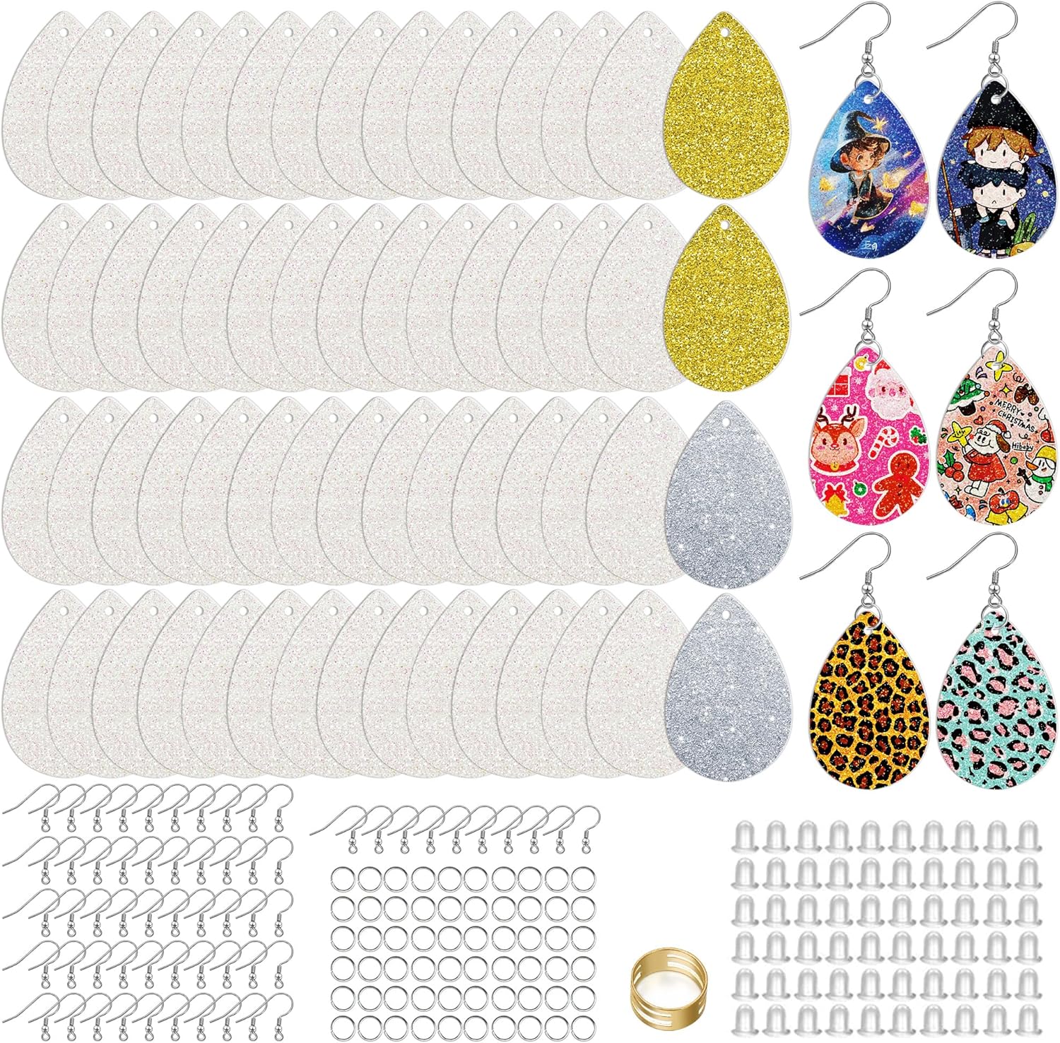 - 🎁【Sublimation Earrings Kit】60pcs sublimation blank teardrop glitter leather earrings,💧60pcs earring hooks💧 60pcs jump rings💧60pcs earring backs💧1 sublimation paper with pattern 💧1 jump ring opener