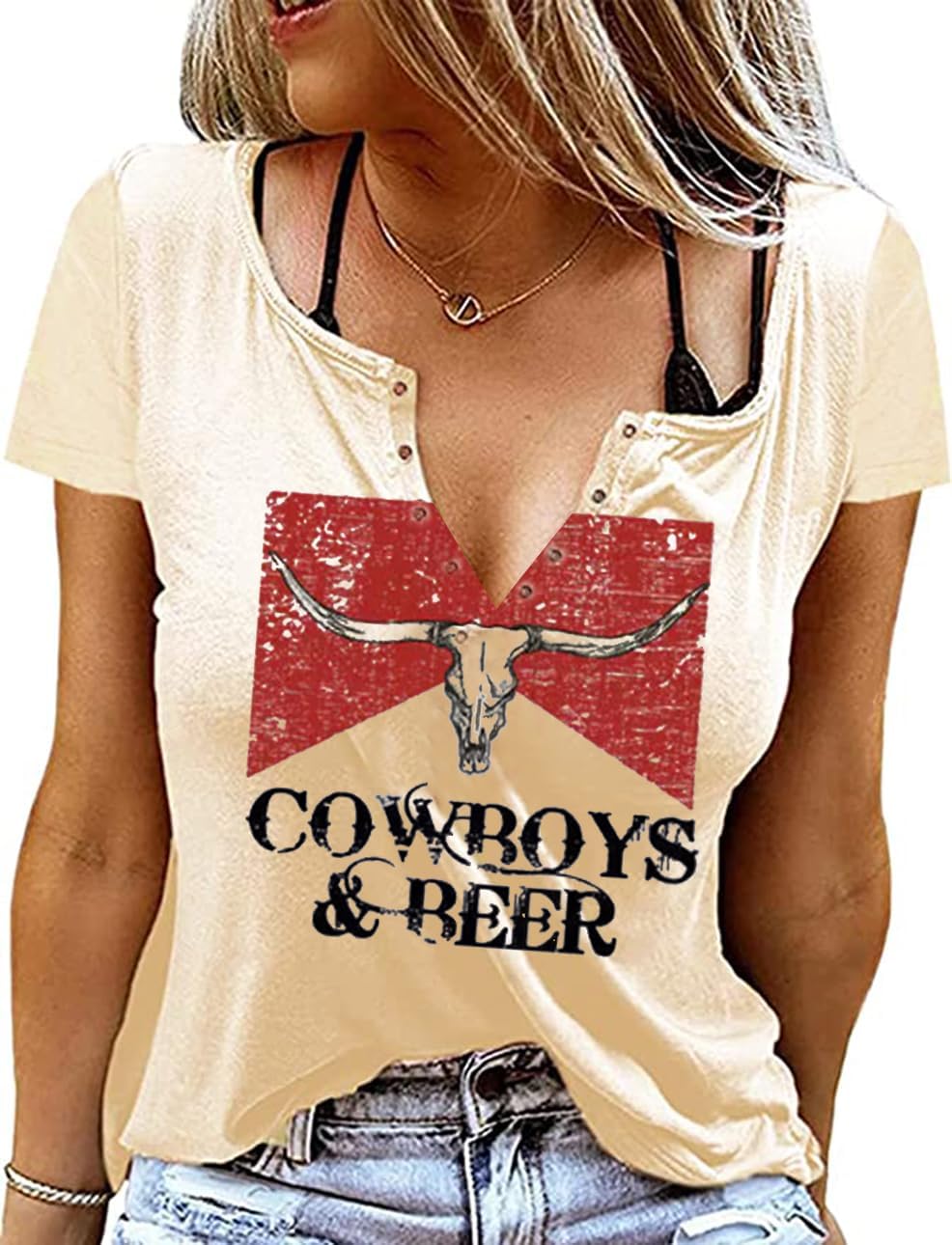 Cowboys & Beer Shirt for Women Country Music Tshirt Vintage Western Steer Skull Graphic Tees Cowboy Rodeo Blouse Top