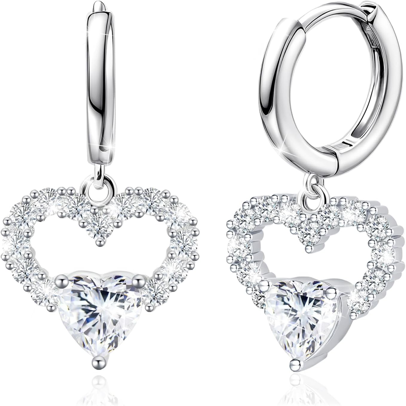 Sterling Silver Dangle Hoop Earrings Charms Lover Heart with White Plated CZ Love Heart Hypoallergenic Fashion Jewelry for Sensitive Ears Dainty Birthday Gift for Women