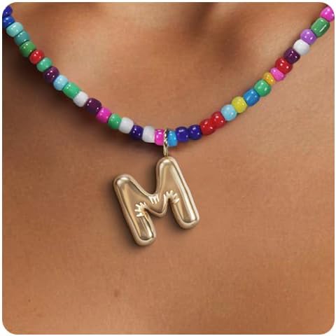 Colorful Initial Necklaces for Women – Bubble Letter Necklace - 14K Gold Plated Letter Beaded Choker, Dainty Cute Beach Boho Necklaces for Women Adjustable Beach Jewelry Gift Colorful Necklace