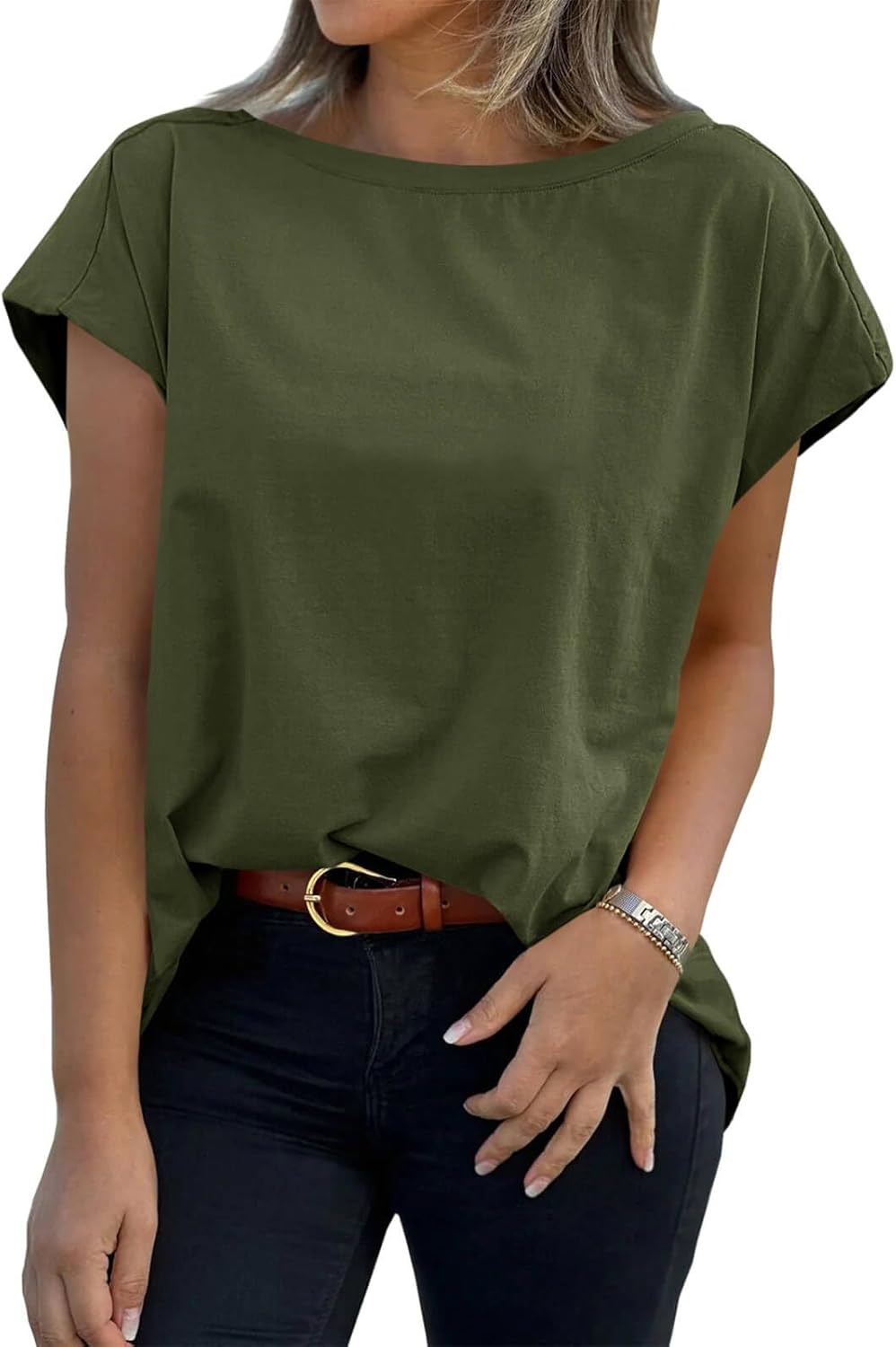 Tankaneo Womens Cap Sleeve Tops Boat Neck T-Shirts Summer Casual Loose Fit Basic Tees