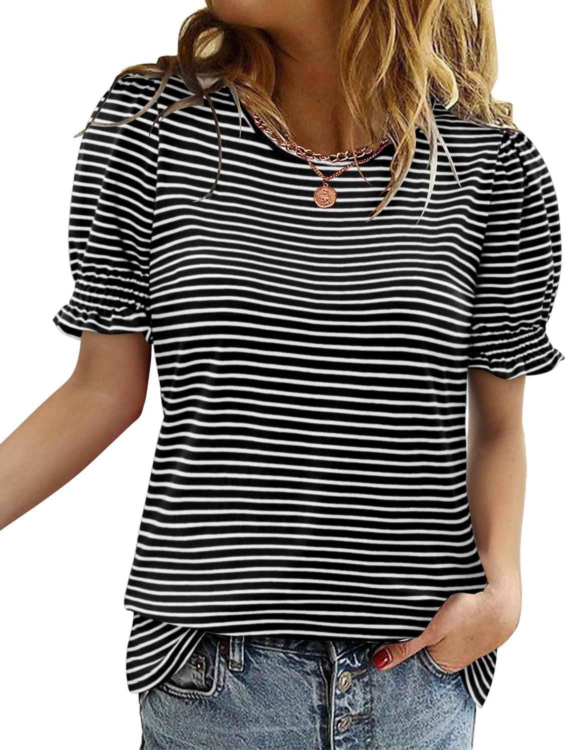 Dokotoo Women's Casual Short Puff Sleeve Crew Neck Striped T Shirts Summer Tops